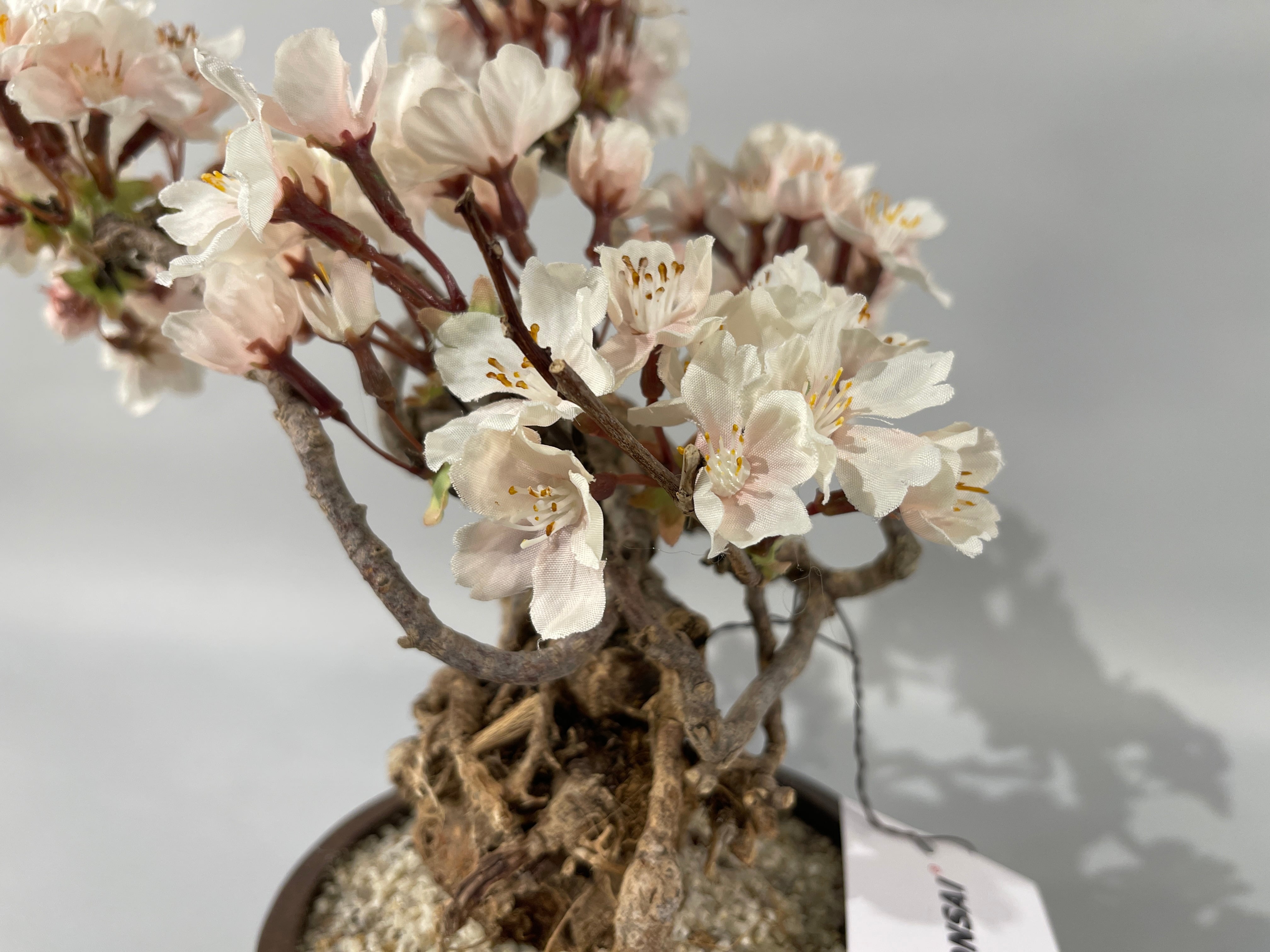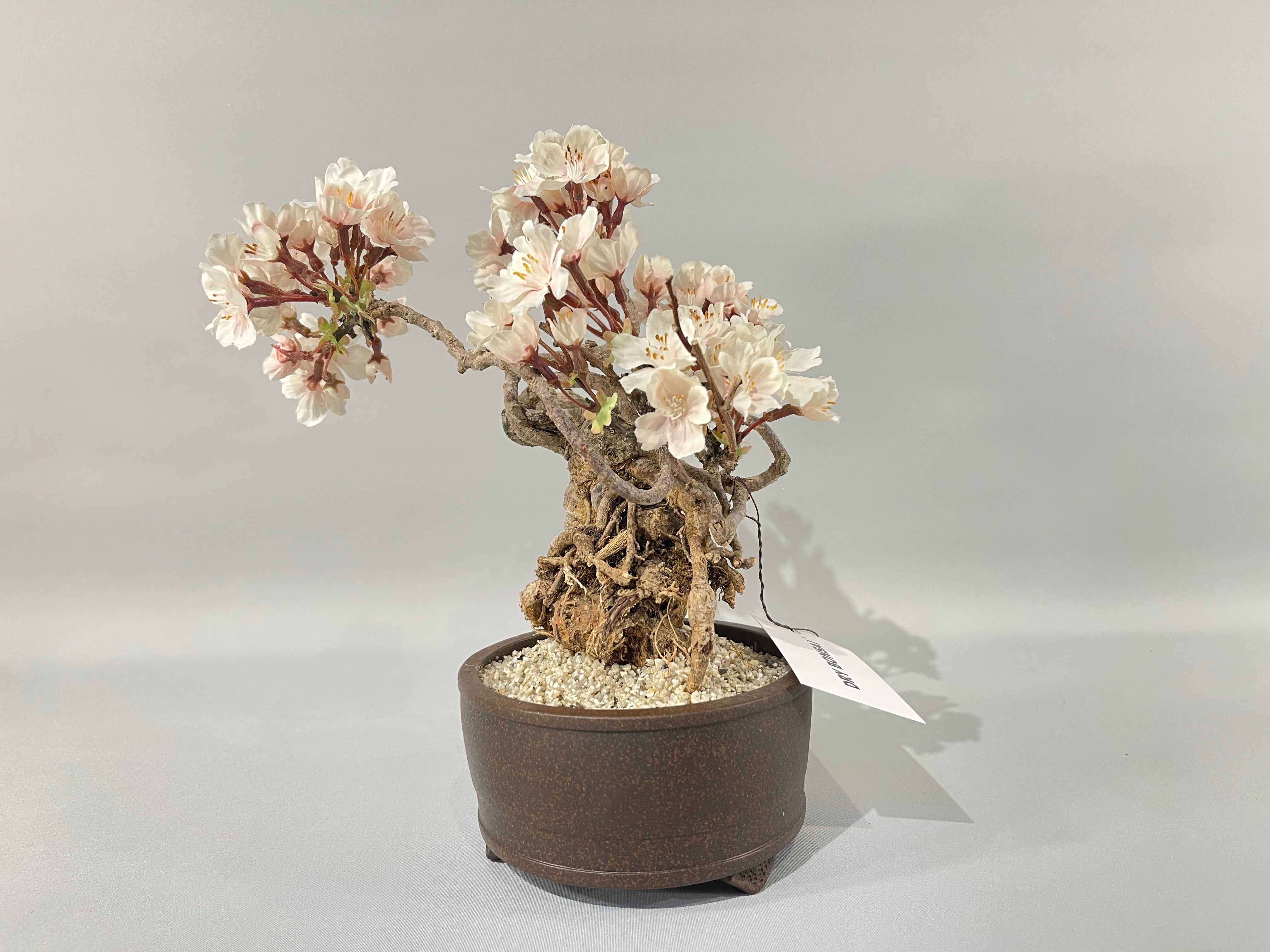 ベースとなる古木の幹は、長い歳月を経て複雑に絡み合い、自然が作り出した彫刻のような圧倒的な質感を放っています。そこへ、春の息吹を感じさせるアーティフィシャルの桜の花を贅沢に配しました。古木の持つ「静」のエネルギーと、桜の花が放つ「動」の華やかさが絶妙に融合し、小さな鉢の中に日本の春の情景が永遠の姿となって凝縮されています。