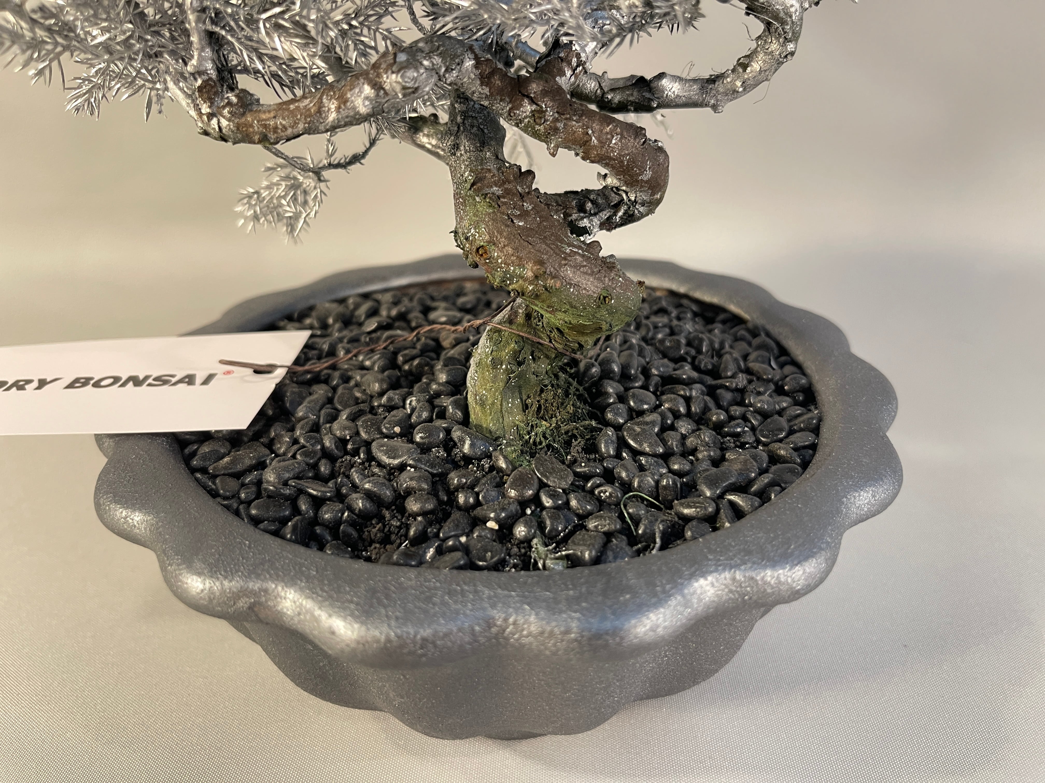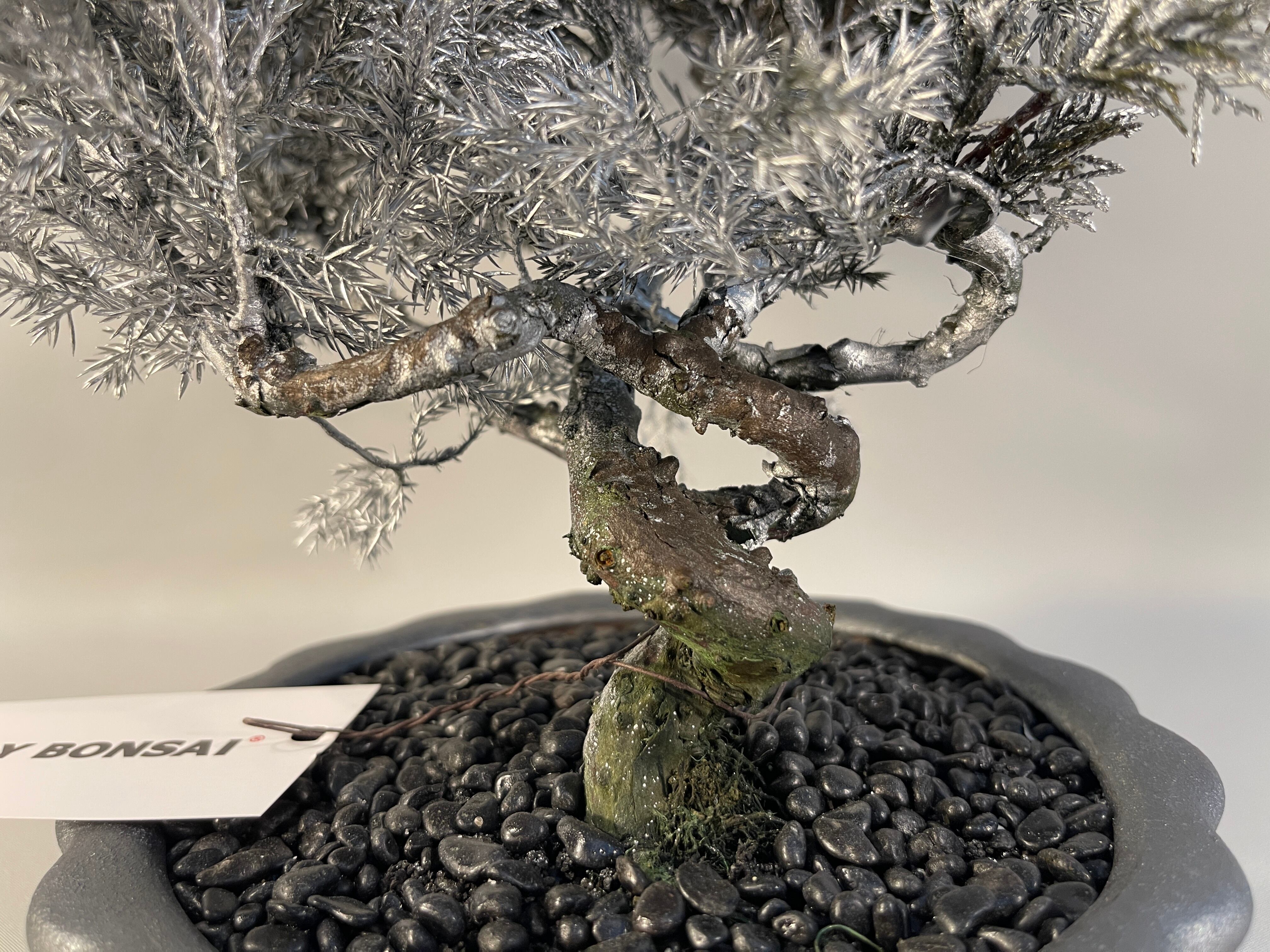 重厚感のある盆栽鉢に、足元の黒砂固めが銀色の樹形を鮮やかに際立たせ、モノトーンの対比が美しい「至高のインテリアアート」へと昇華させています。