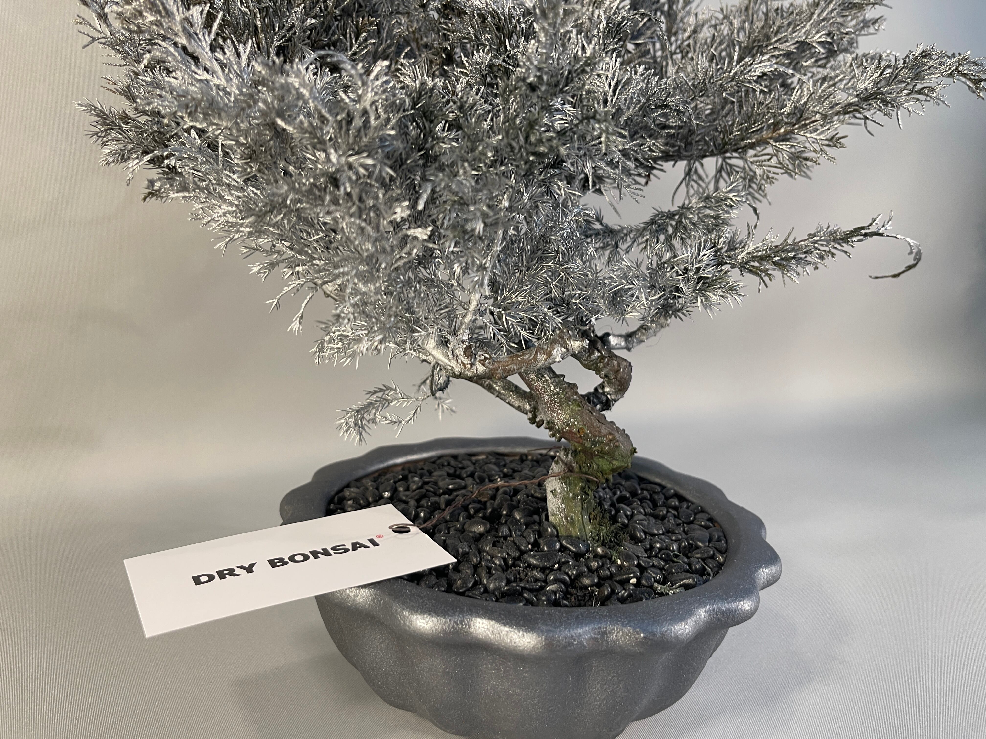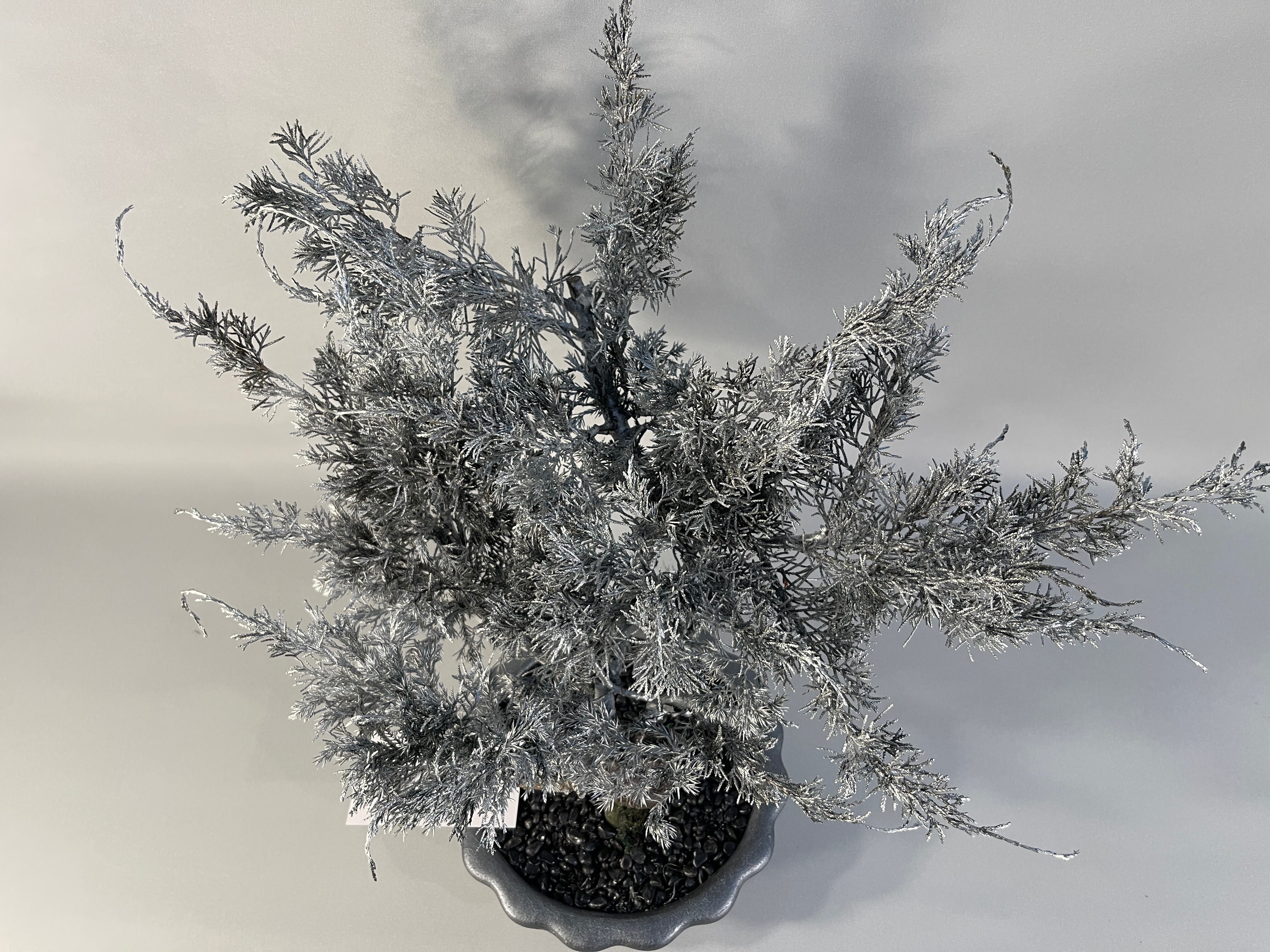 枝葉には、あえて銀色のスプレー塗装を施すことで、従来の盆栽にはないモダンで無機質な美しさを追求しました。プリザーブド仕上げによる繊細な質感はそのままに、光の当たり方で表情を変えるメタリックな輝きが、空間に洗練された冬の静寂をもたらします。