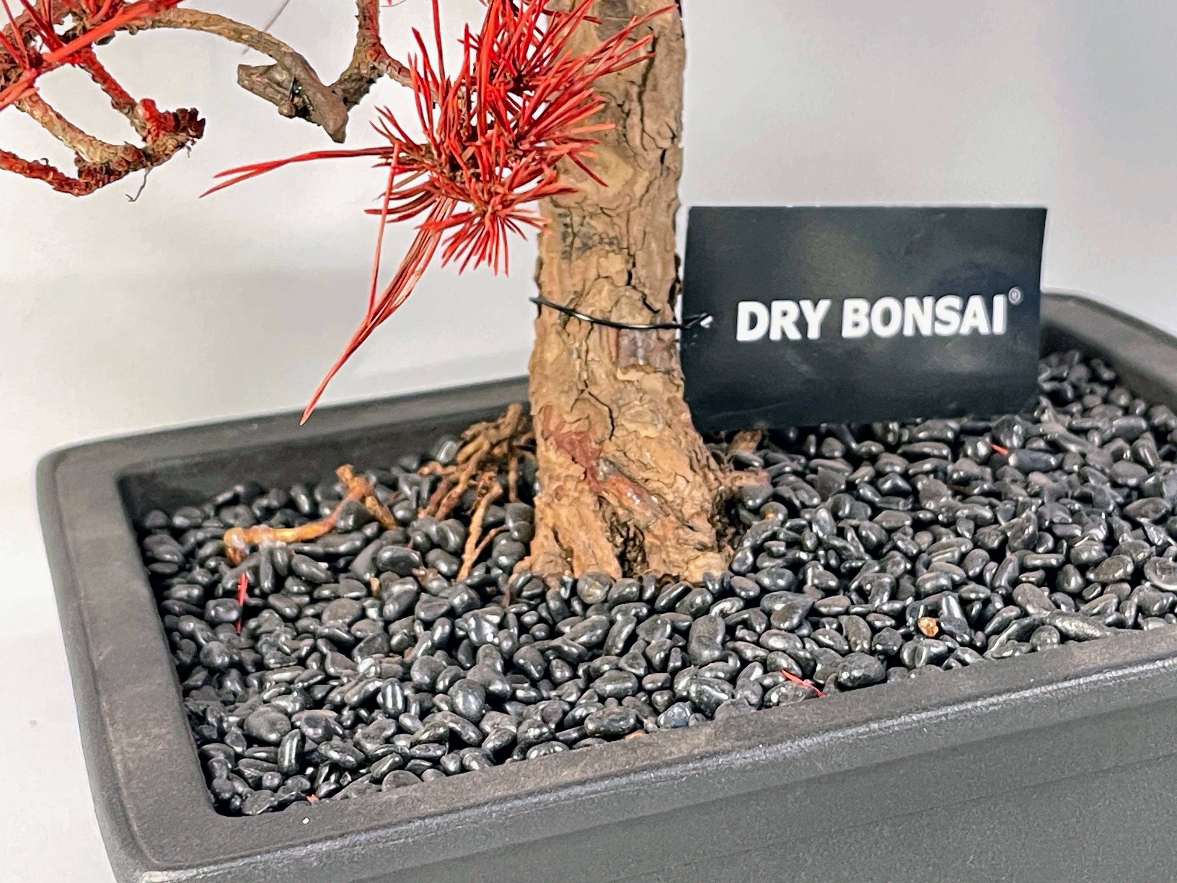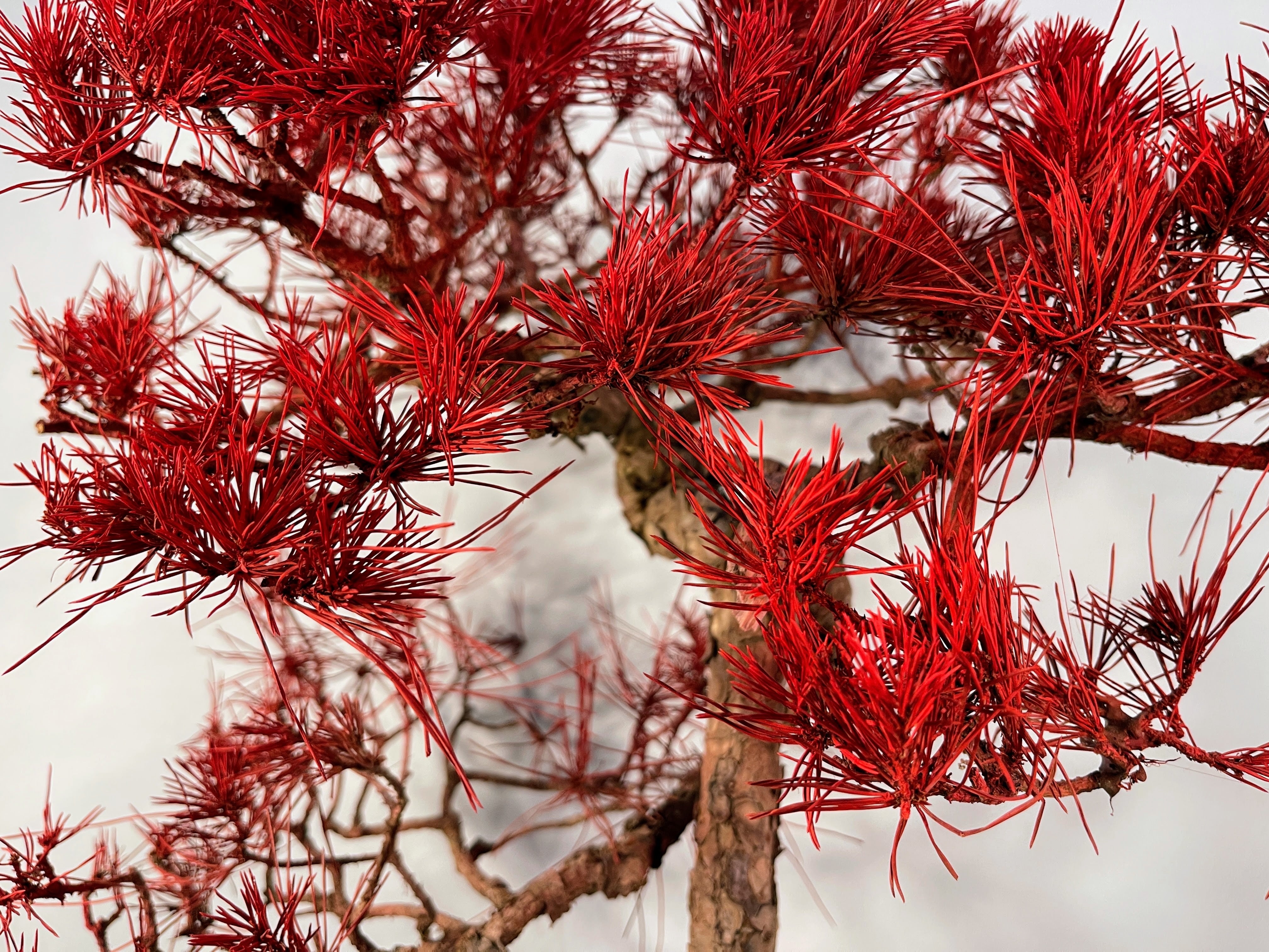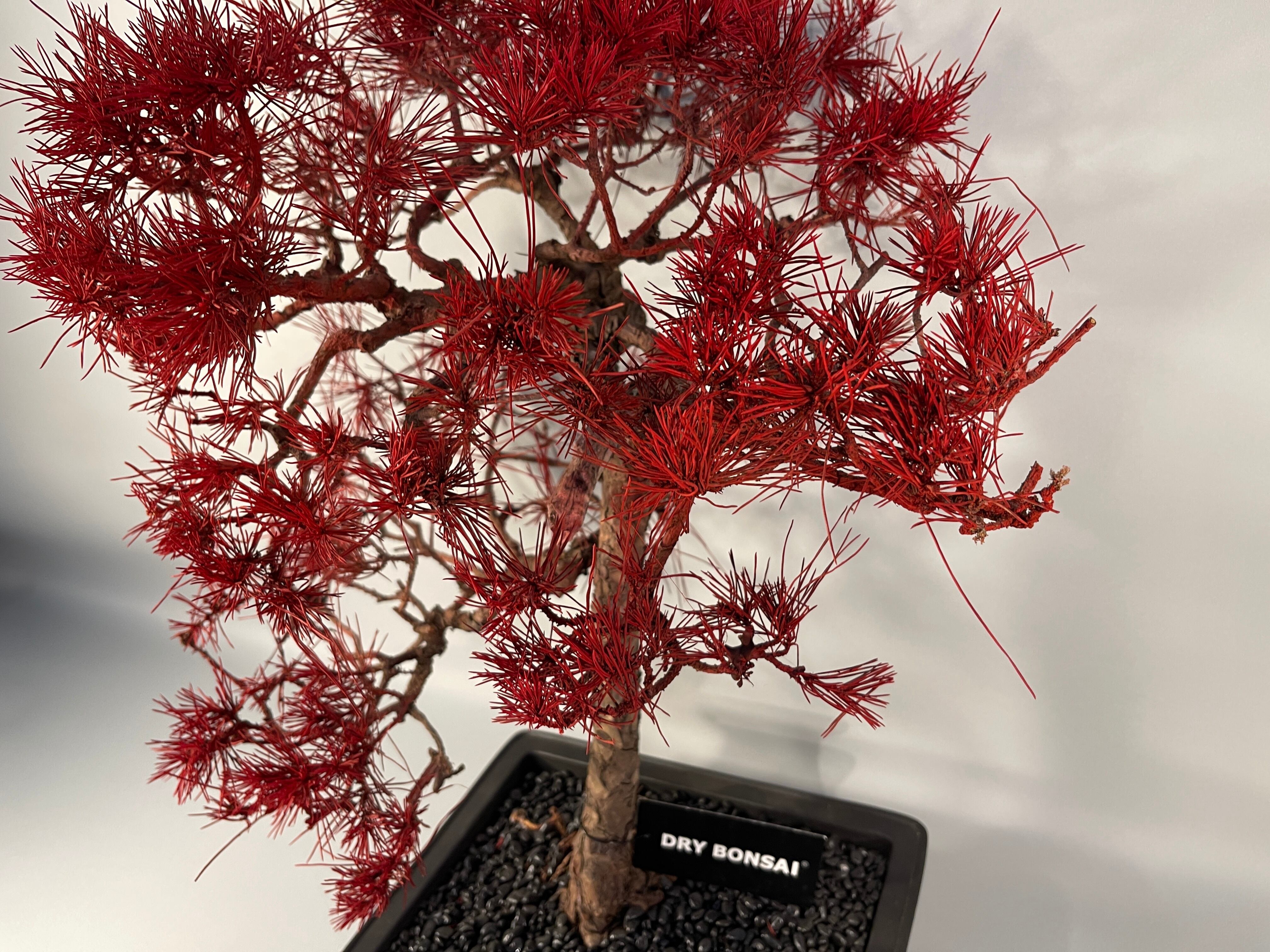 最大の特徴は、全身に纏った鮮烈な「紅」の色彩です。本来の赤松が持つ生命力を超越し、アート作品としての革新性を追求しました。ドライ仕立てによる緻密な枝葉の重なりが、光を受けることで深みのある陰影を描き出し、見る角度によって刻々とその表情を変えます。