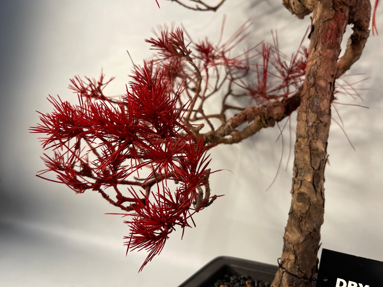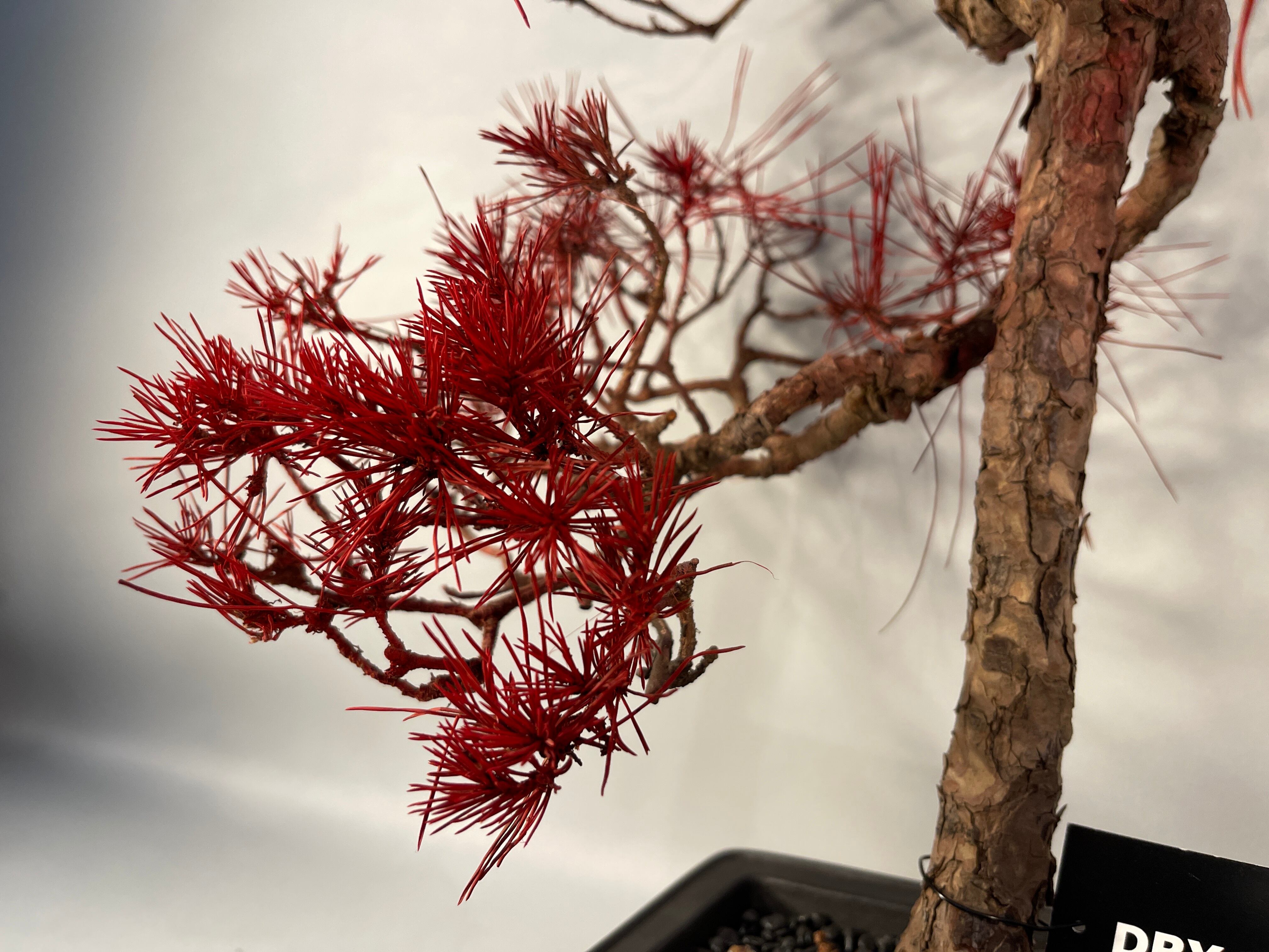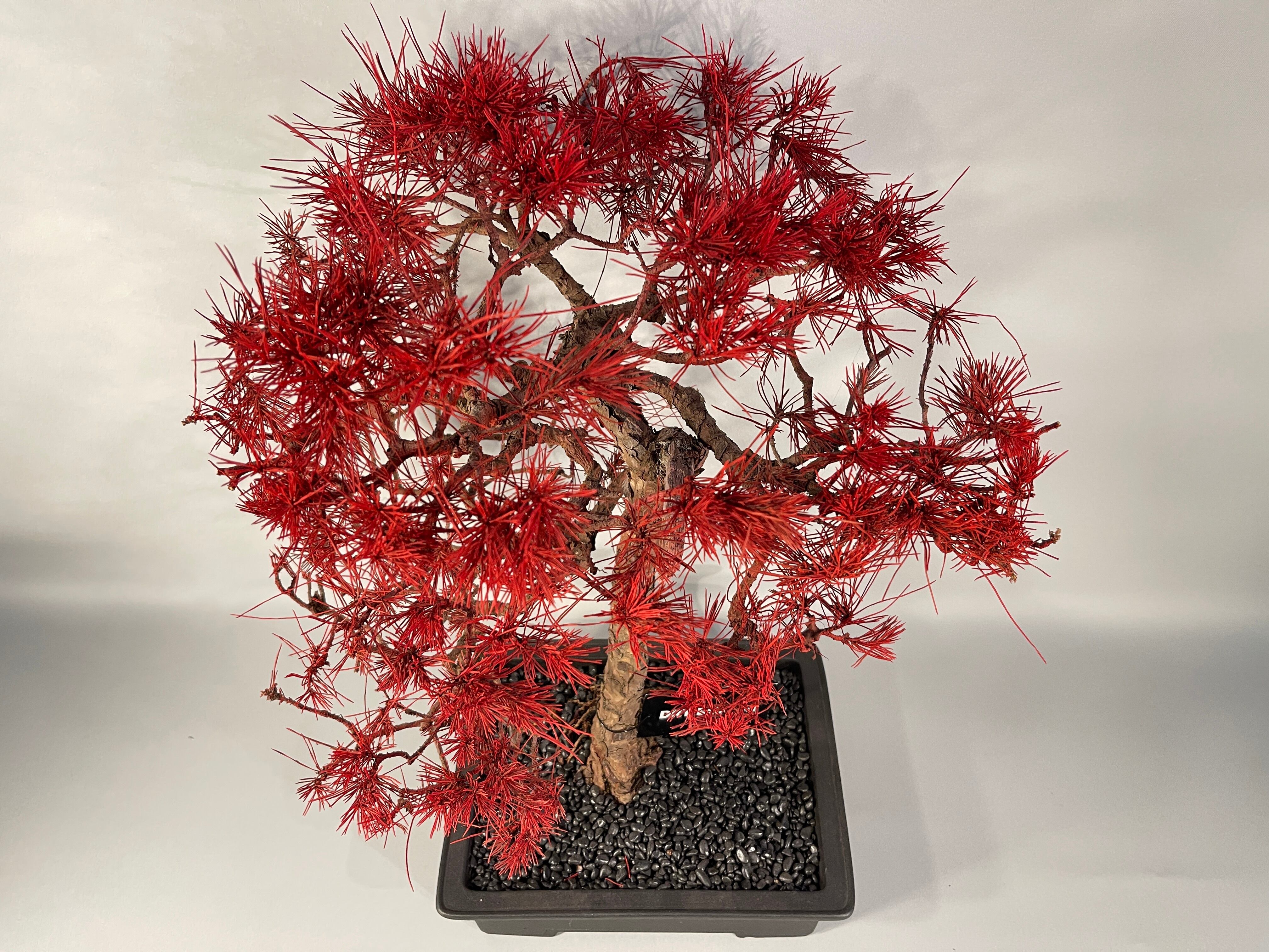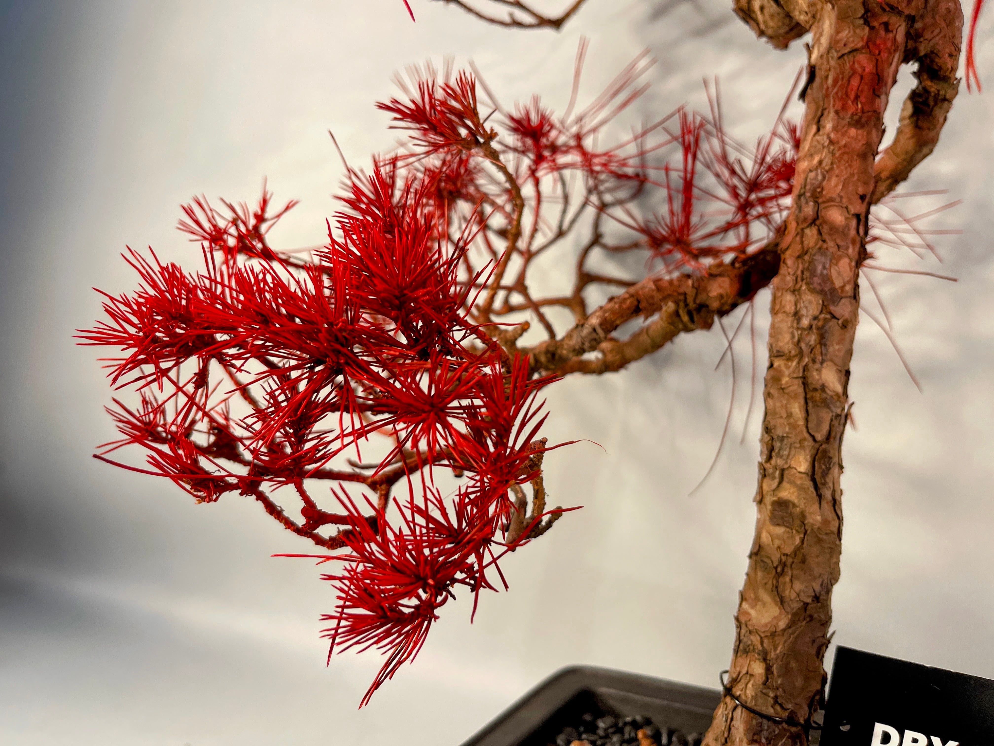 最大の特徴は、全身に纏った鮮烈な「紅」の色彩です。本来の赤松が持つ生命力を超越し、アート作品としての革新性を追求しました。ドライ仕立てによる緻密な枝葉の重なりが、光を受けることで深みのある陰影を描き出し、見る角度によって刻々とその表情を変えます。