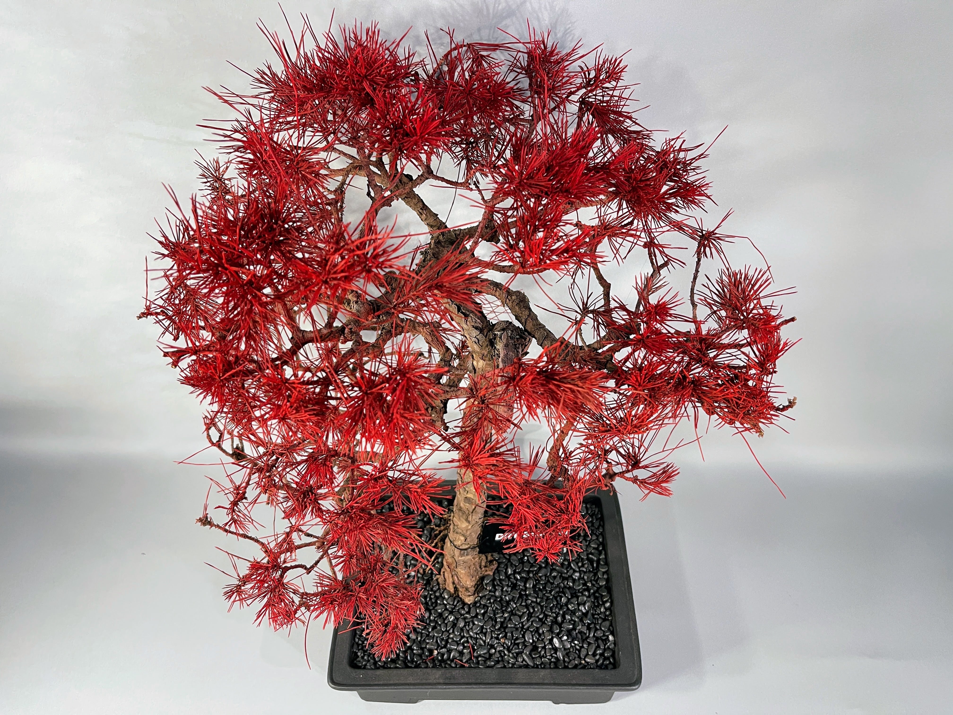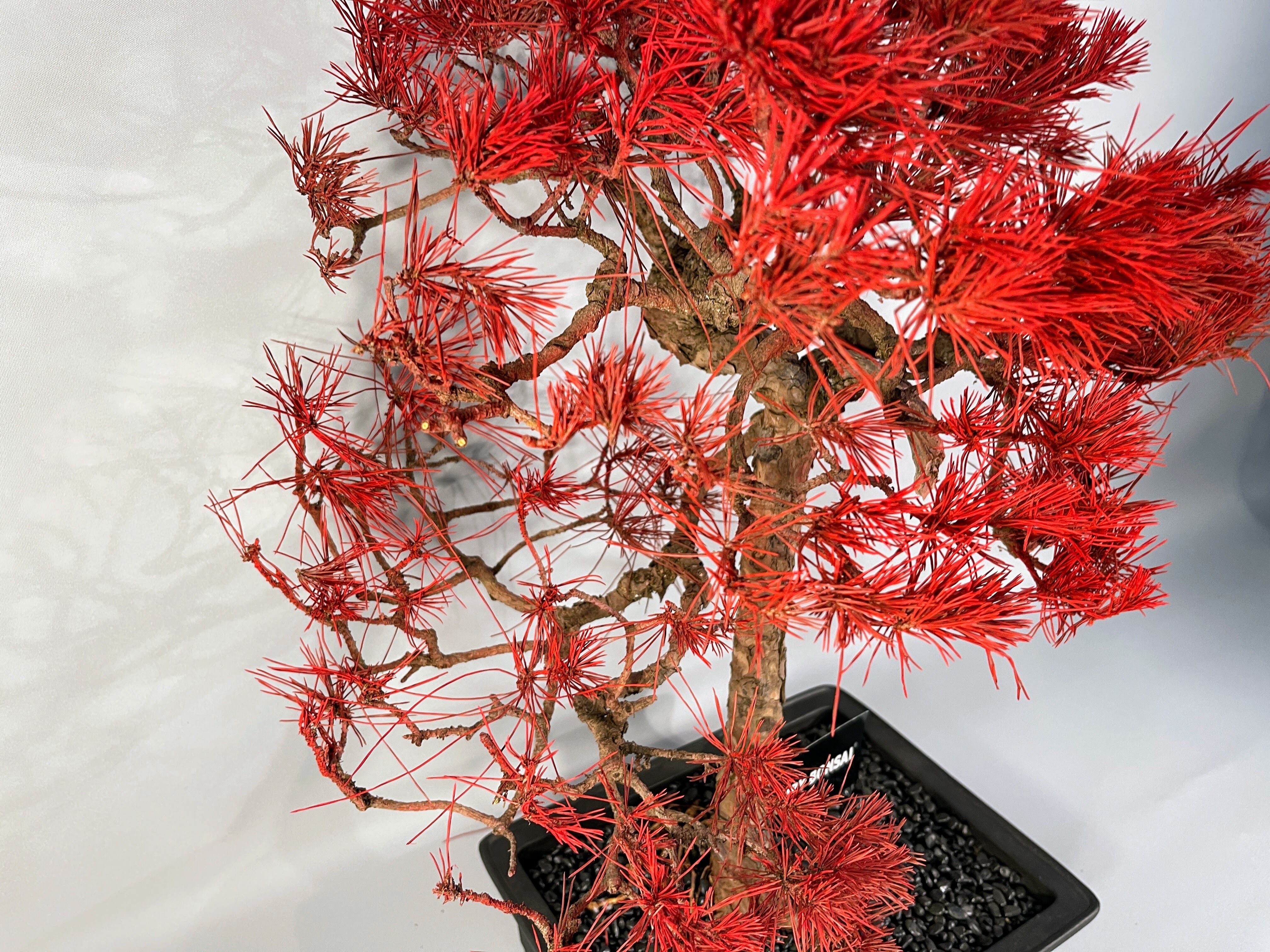 【作品解説】 燃え上がるような情熱と、伝統的な和の気品が共鳴する、唯一無二の中品作品です。 ベースとなる樹種には、力強い樹肌が特徴の「赤松」を使用。天に向かって真っ直ぐに伸びる主幹から、四方へとダイナミックに広がる枝ぶりは、空間を支配するほどの圧倒的なエネルギーを放ちます。
