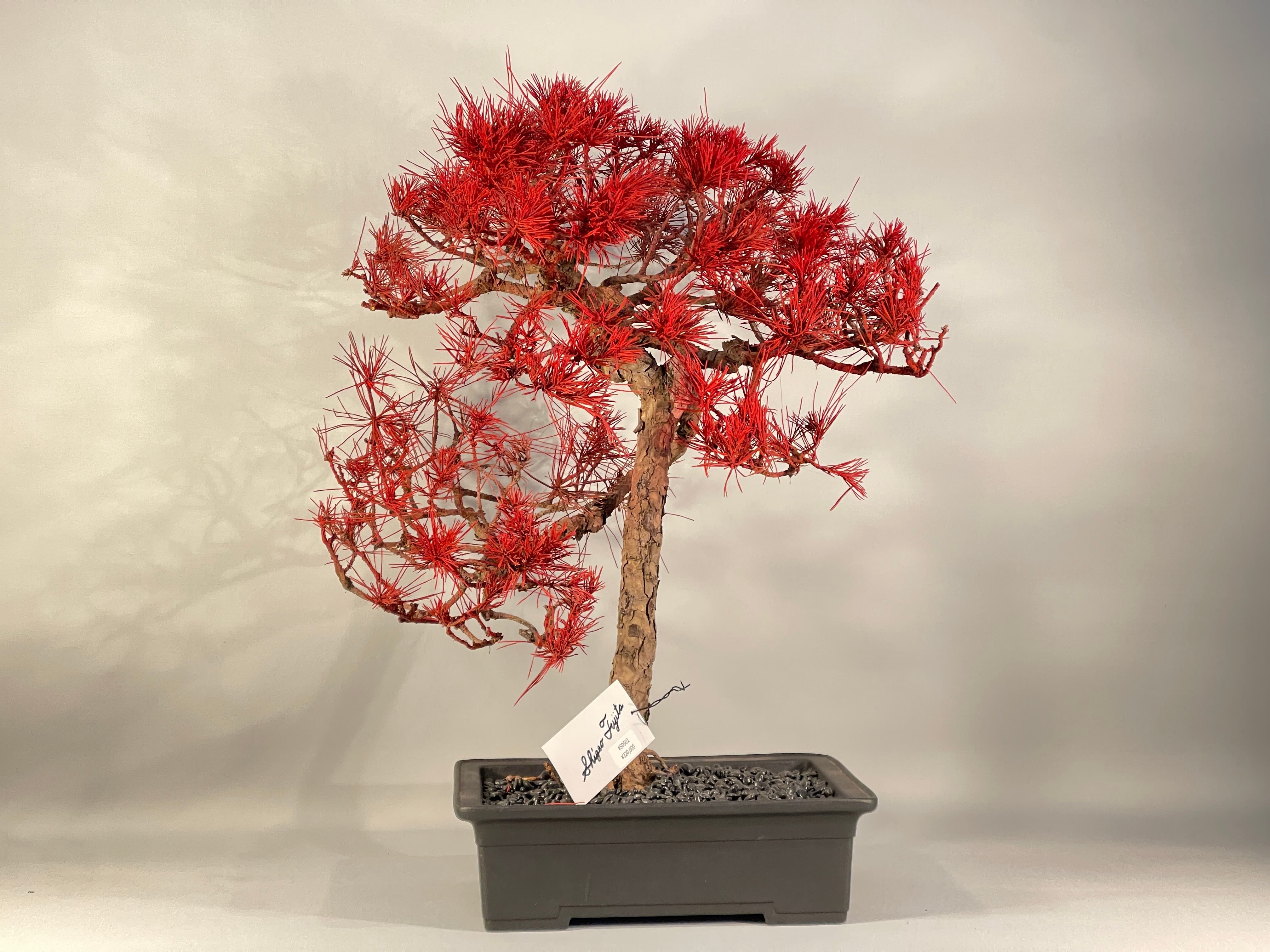 【作品解説】 燃え上がるような情熱と、伝統的な和の気品が共鳴する、唯一無二の大型作品です。 ベースとなる樹種には、力強い樹肌が特徴の「赤松」を使用。天に向かって真っ直ぐに伸びる主幹から、四方へとダイナミックに広がる枝ぶりは、空間を支配するほどの圧倒的なエネルギーを放ちます。