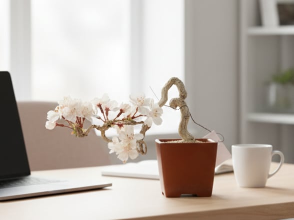 艶やかな飴色の鉢と、清涼感のある矢作砂が桜の色調を引き立て、モダンなインテリアにも伝統的な空間にも調和します。季節を問わず、あなたの日常に「永遠のお花見」という贅沢なひとときを届ける、情緒豊かな一鉢です。