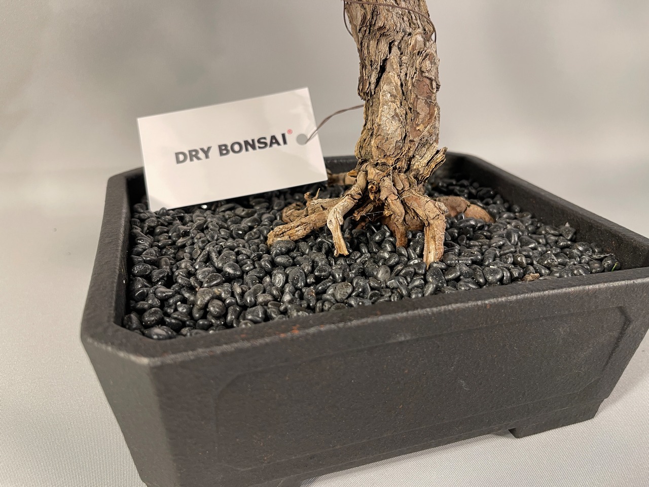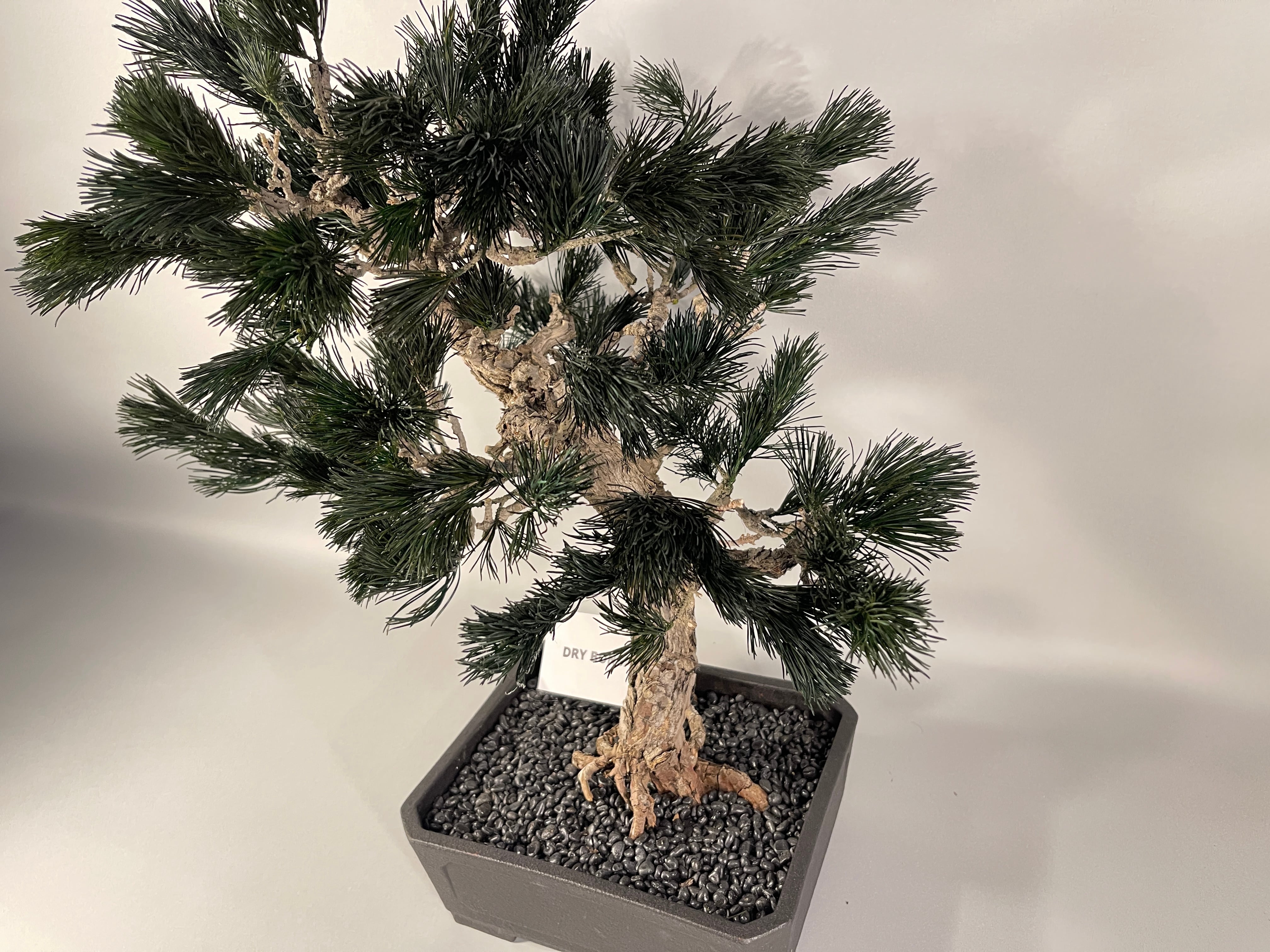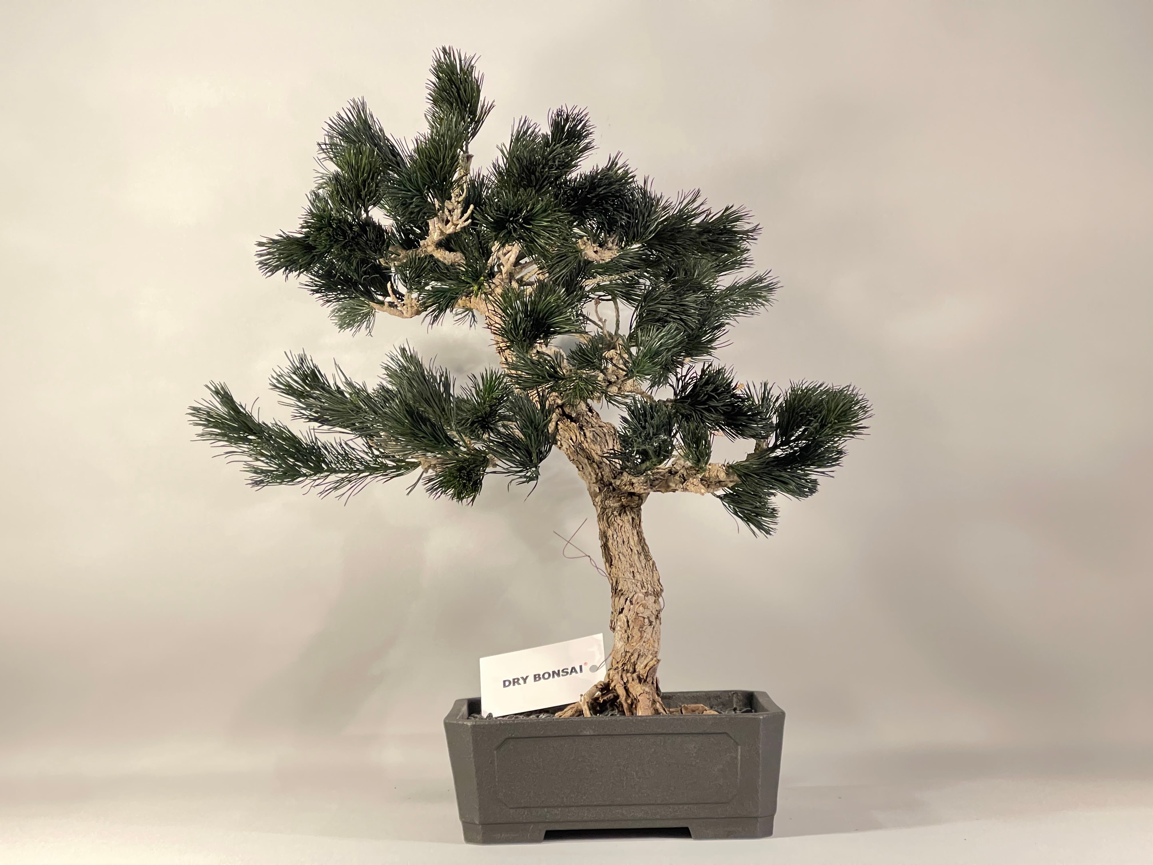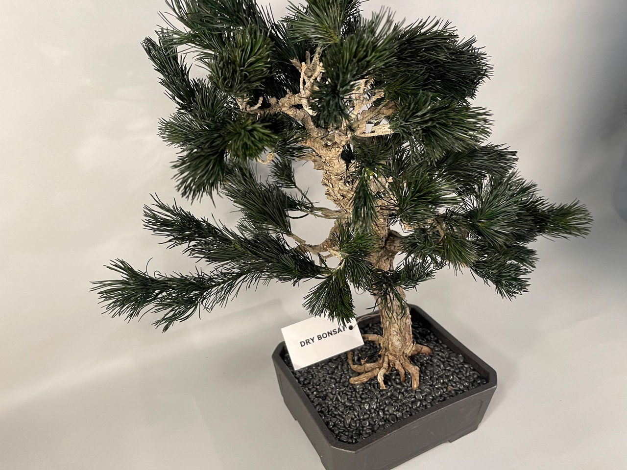 枝葉には、瑞々しい質感を永く保つプリザーブド仕立ての松葉を採用。黒塗りの盆栽鉢と足元の黒玉石が、深い緑をより一層鮮やかに際立たせ、空間に凛とした静謐さをもたらします。
