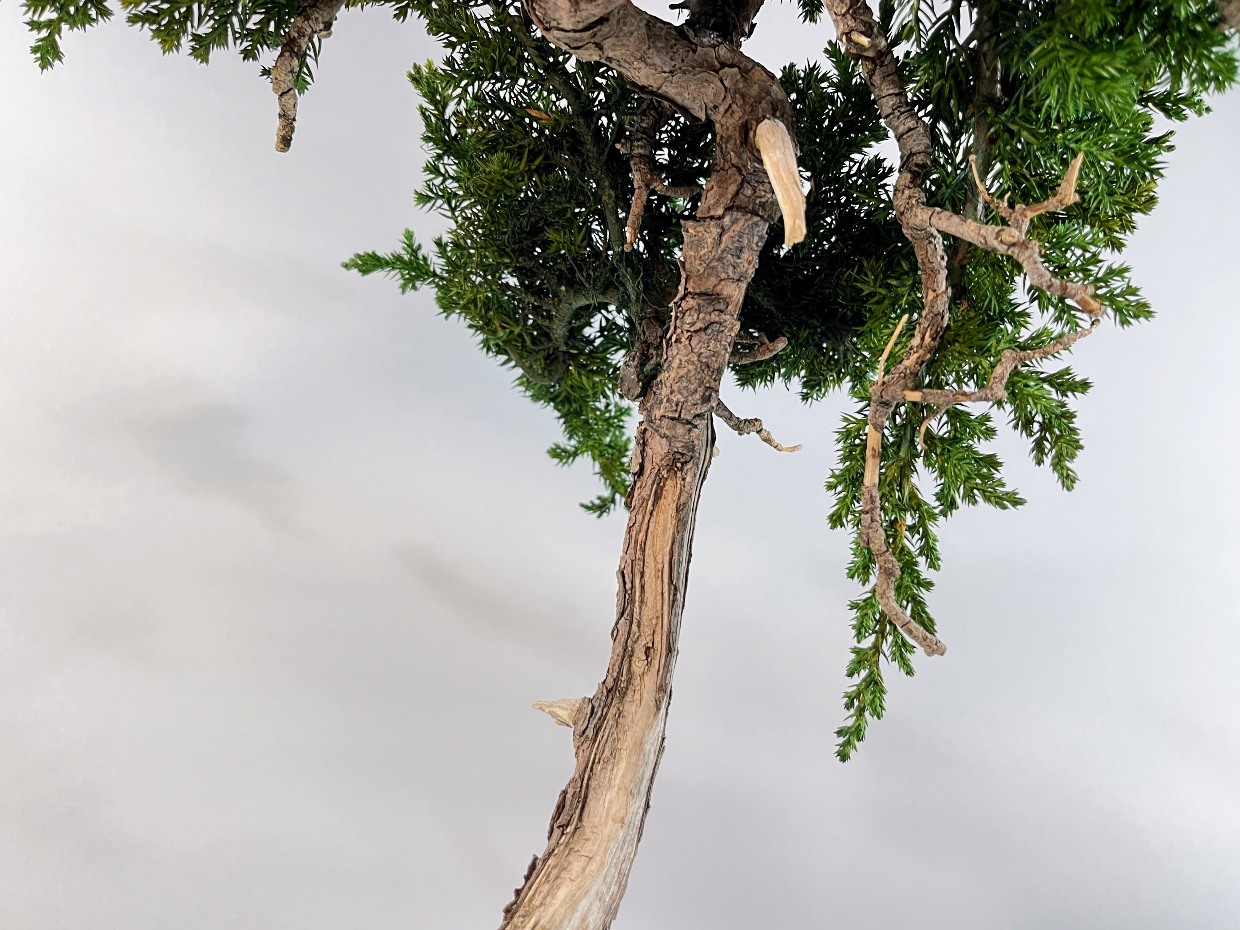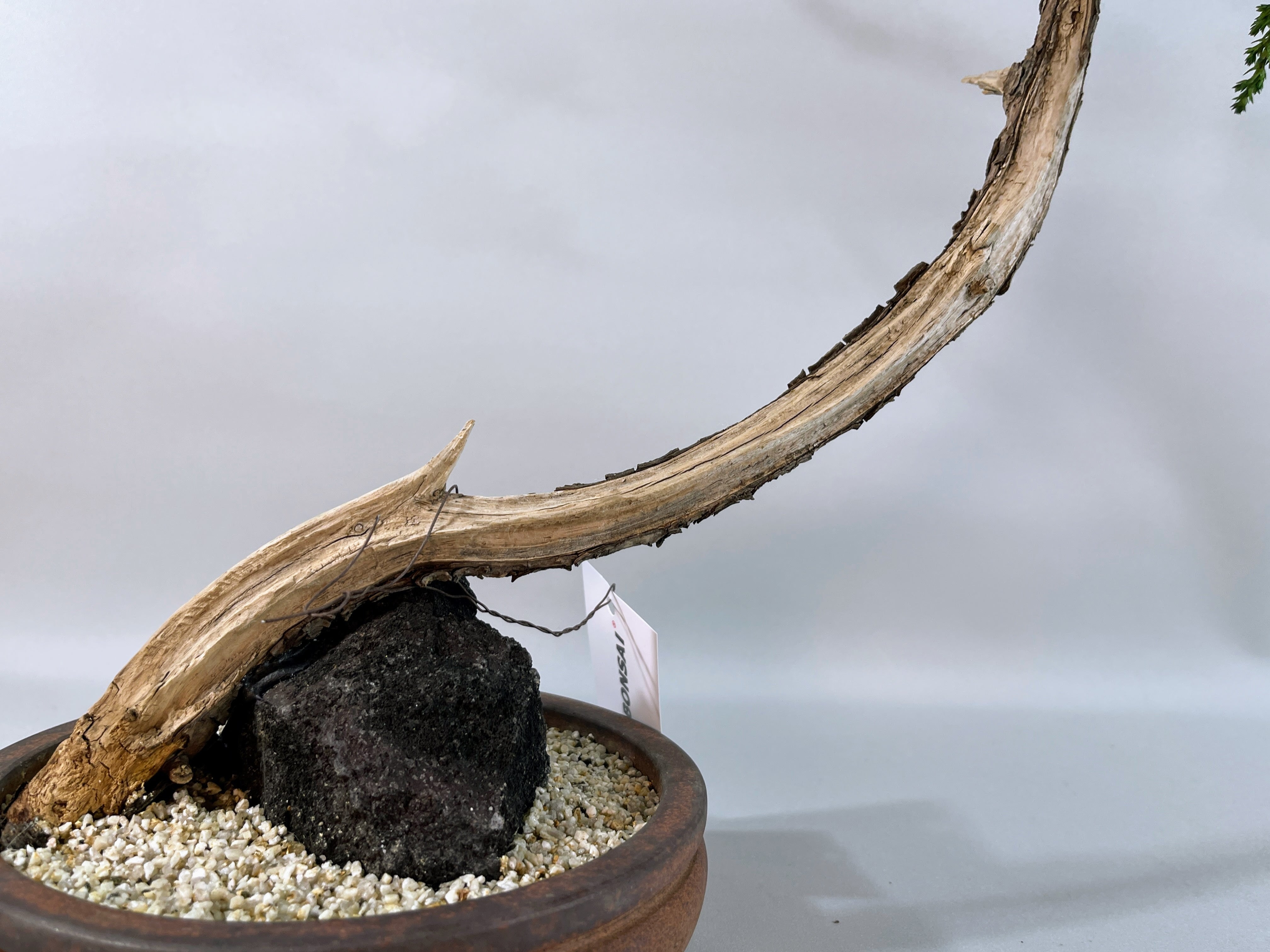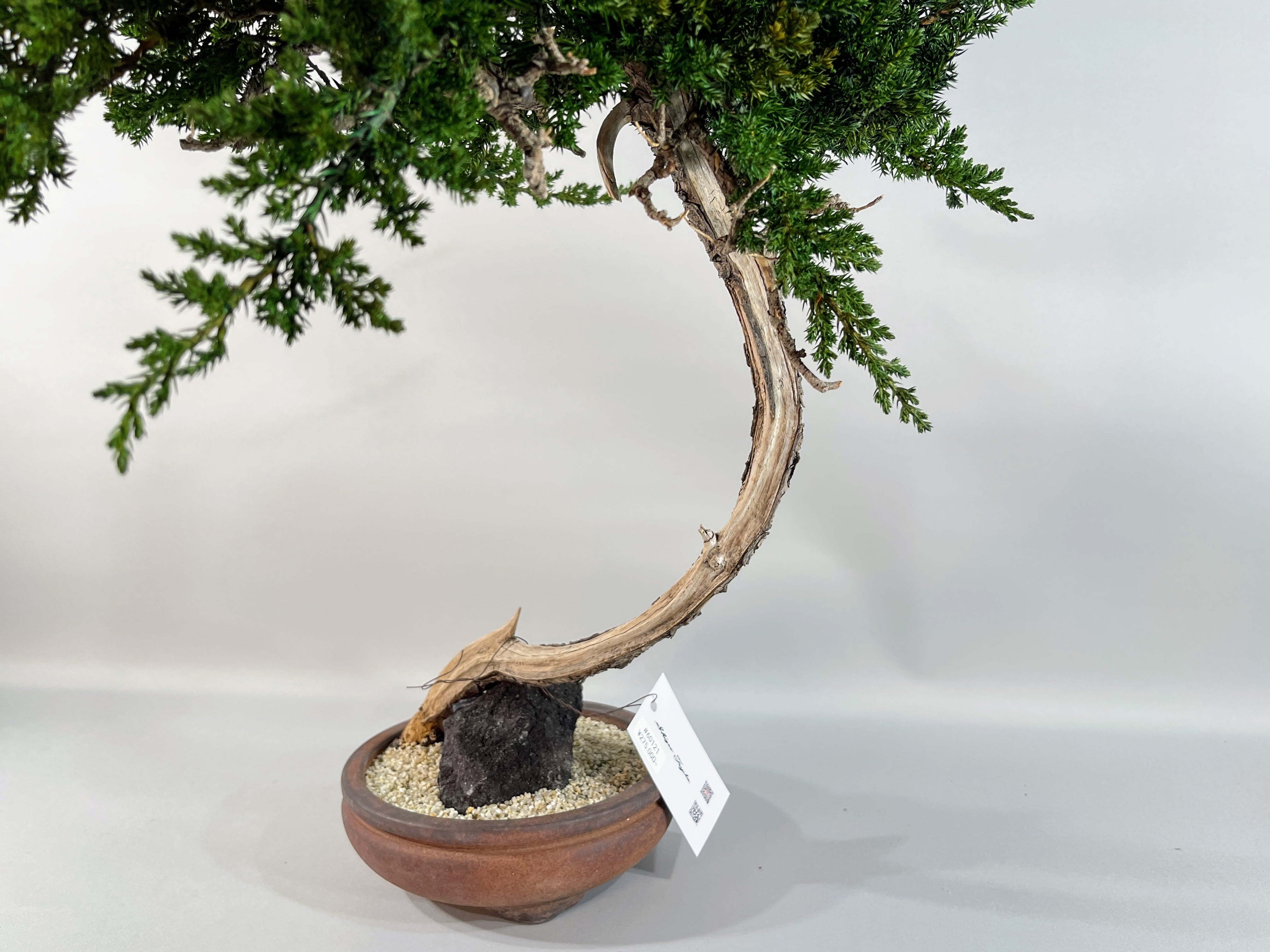 【作品解説】 天へと向かって長く、しなやかに伸びる幹のラインが印象的な「昇天」。 極限まで無駄を削ぎ落とした真柏のシャリ(白骨化した幹)が、大地から解き放たれ、空へと昇っていく龍のような神々しさを感じさせます。