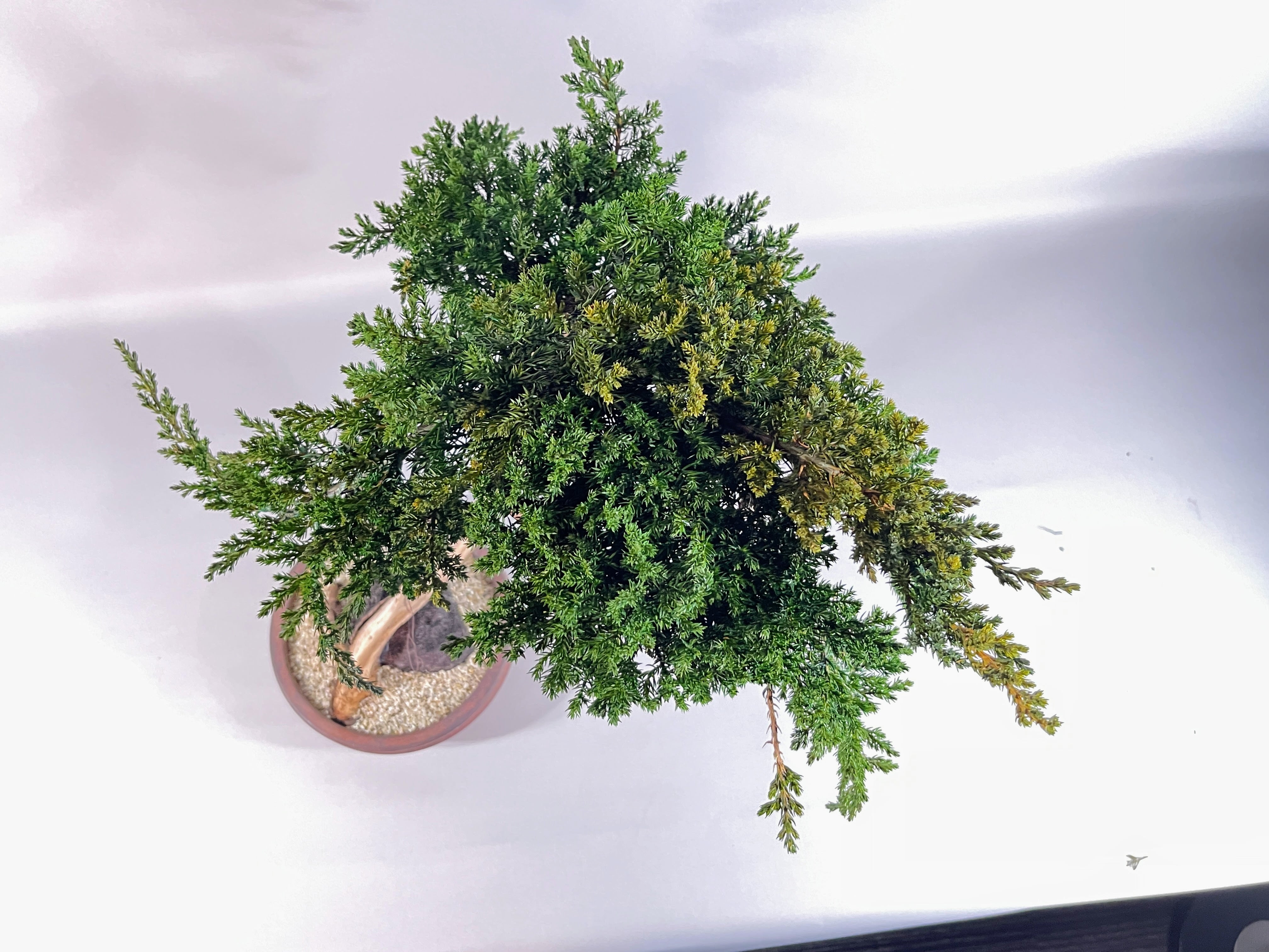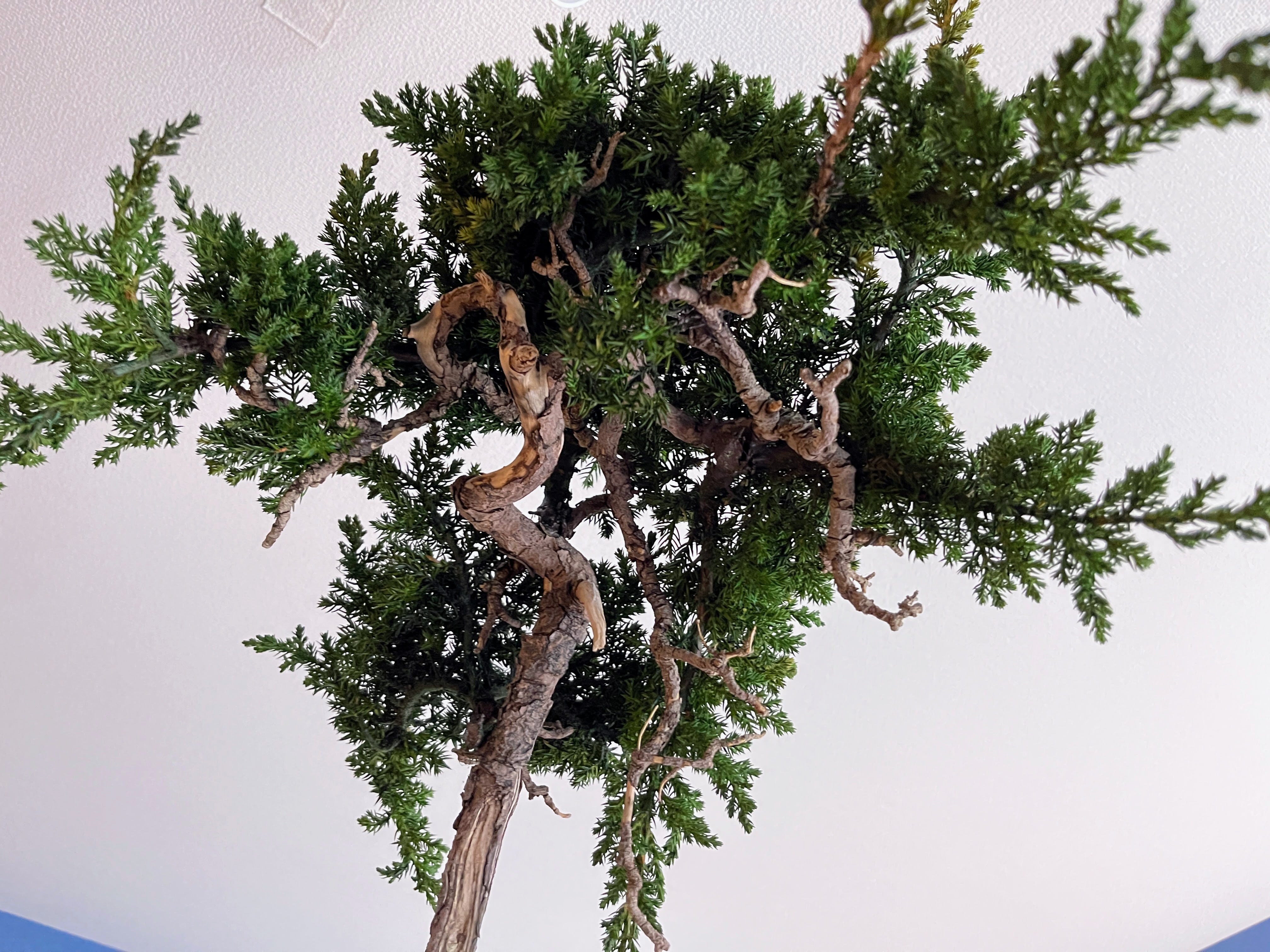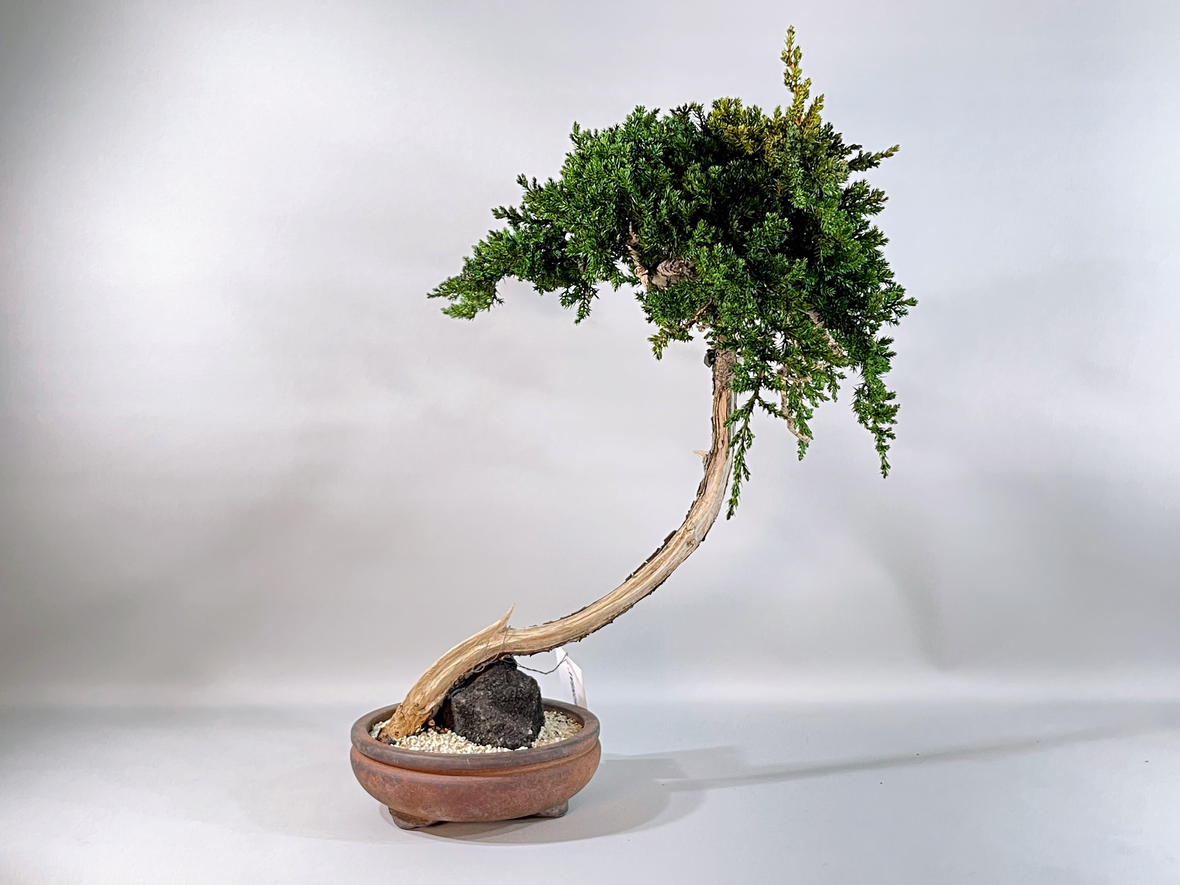 【作品解説】 天へと向かって長く、しなやかに伸びる幹のラインが印象的な「昇天」。 極限まで無駄を削ぎ落とした真柏のシャリ(白骨化した幹)が、大地から解き放たれ、空へと昇っていく龍のような神々しさを感じさせます。