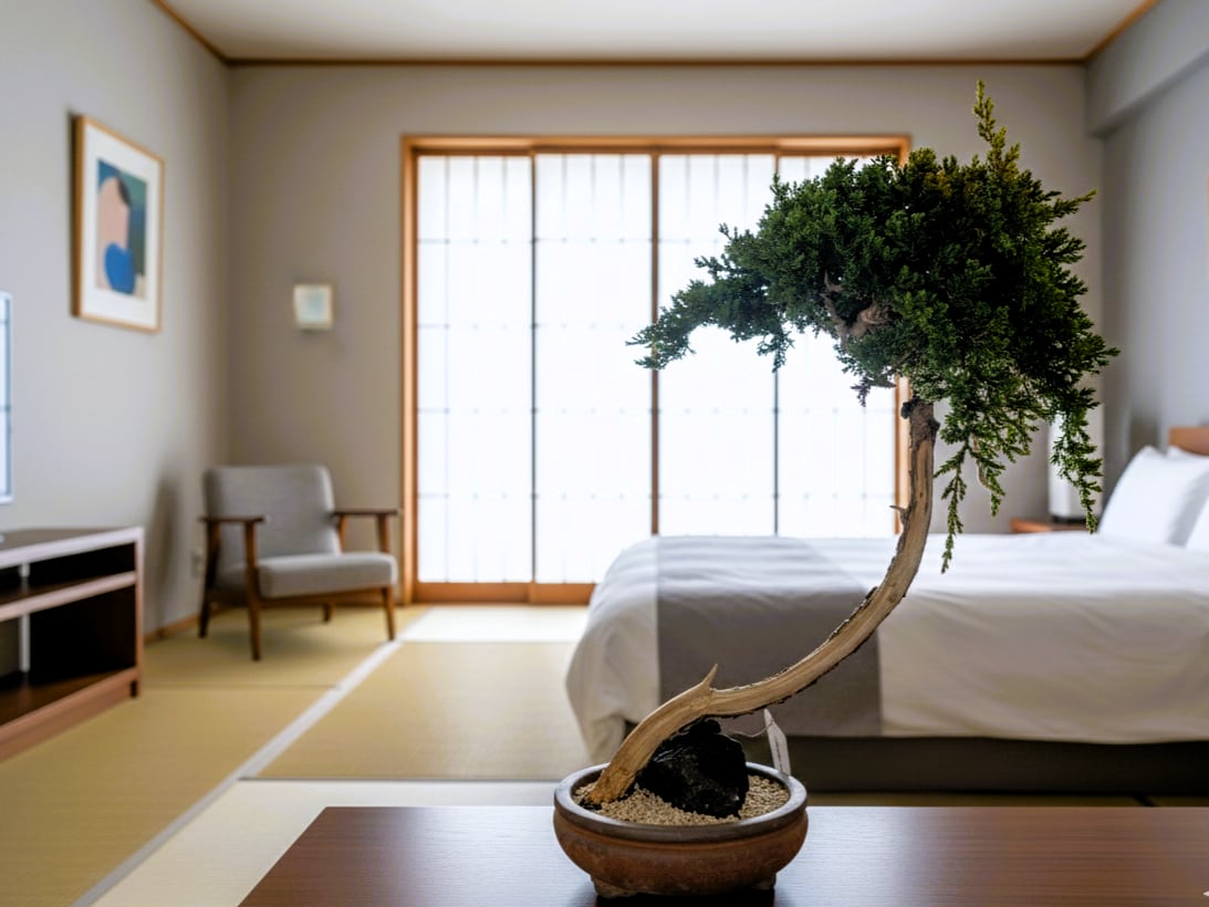 繊細な幹の先には、鮮やかな緑が美しいプロカンベンスオーレアを配し、プリザーブド仕立てにすることでその瑞々しい質感を永く封じ込めました。足元の力強い石添えと矢作砂が、空中へ広がる樹形のダイナミズムをより一層際立たせます。