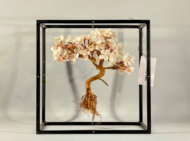 作品名:ドライ盆栽 「浮遊」 品番 :#60110 樹種 :真柏・全表皮剥き 枝葉 :アーテイフィシャルの桜の花 飾り方:フレーム吊り フレーム:アイアン製 サイズ:WDH 300*200*300 中品 送料 :120サイズ 【作品解説】 重力から解き放たれ、静止した刻(とき)の中に浮かぶ桜。 ドライ盆栽の新たな境地を切り拓く、アイアンフレーム吊り仕立ての意欲作「浮遊」です。 樹種には、緻密な木肌を持つ「真柏(しんぱく)」を使用。全ての表皮を丁寧に剥ぎ取ることで、真柏特有のなめらかな幹の曲線と、生命の芯が持つ力強い美しさを白日の下に晒しました。そのストイックなまでに磨き上げられた幹に、可憐なアーティフィシャルの桜を配し、春の儚さと力強さが共存する幻想的な光景を創り出しています。 鉢という器を離れ、フレームの中で宙を舞う姿は、どの角度から眺めても驚きと安らぎを与えてくれます。伝統的な盆栽の様式美を現代アートへと昇華させた、洗練された空間の主役にふさわしい逸品です。